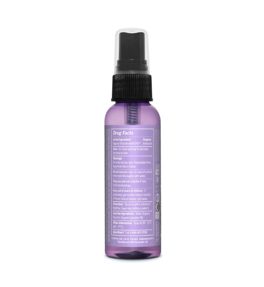 USDA ORGANIC INGREDIENTS ONLY: Dr. Bronner's Organic Hand Sanitizers are formulated with only 4 ingredients—organic fair trade ethyl alcohol, water, organic glycerin, & organic lavender oil. Simple & effective!